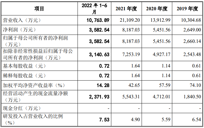 財(cái)務(wù)數(shù)據(jù):2019年-2022年1-6月,公司營業(yè)收入分別為1.03億元、1.39億元、2.11億元和1.08億元,凈利潤分別為2649.00萬元、5451.56萬元、8187.03萬元及3582.54萬元。