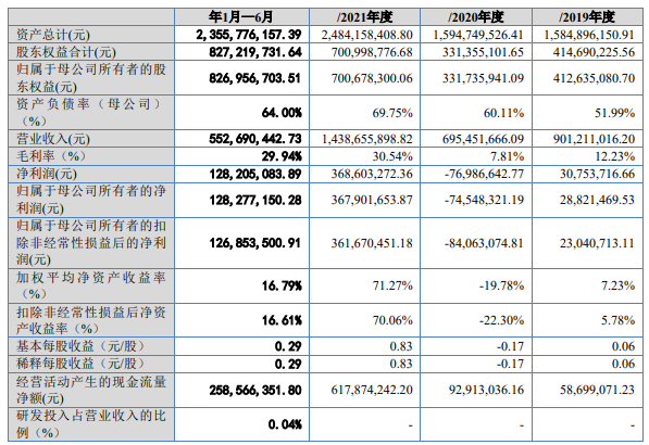 財務數(shù)據(jù)2019年-2022年1-6月,公司營業(yè)收入分別為9.01億元、6.95億元、14.39億元和5.53億元,凈利潤分別為3075.37萬元、-7698.66萬元、3.69億元及1.28億元。