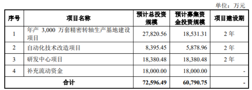 募資用途:瑋碩恒基曾于2018年5月在新三板掛牌,此次申請(qǐng)?jiān)趧?chuàng)業(yè)板上市,瑋碩恒基擬公開發(fā)行股票數(shù)量不超過1,587萬股,發(fā)行完成后,公司總股本不超過6,347萬股。實(shí)際募集資金扣除發(fā)行費(fèi)用后的凈額將全部用于公司主營(yíng)業(yè)務(wù)相關(guān)的項(xiàng)目。此次IPO擬募資6.08億元,用于年產(chǎn)3,000萬套精密轉(zhuǎn)軸生產(chǎn)基地建設(shè)項(xiàng)目、自動(dòng)化技術(shù)改造項(xiàng)目、研發(fā)中心項(xiàng)目、補(bǔ)充流動(dòng)資金。