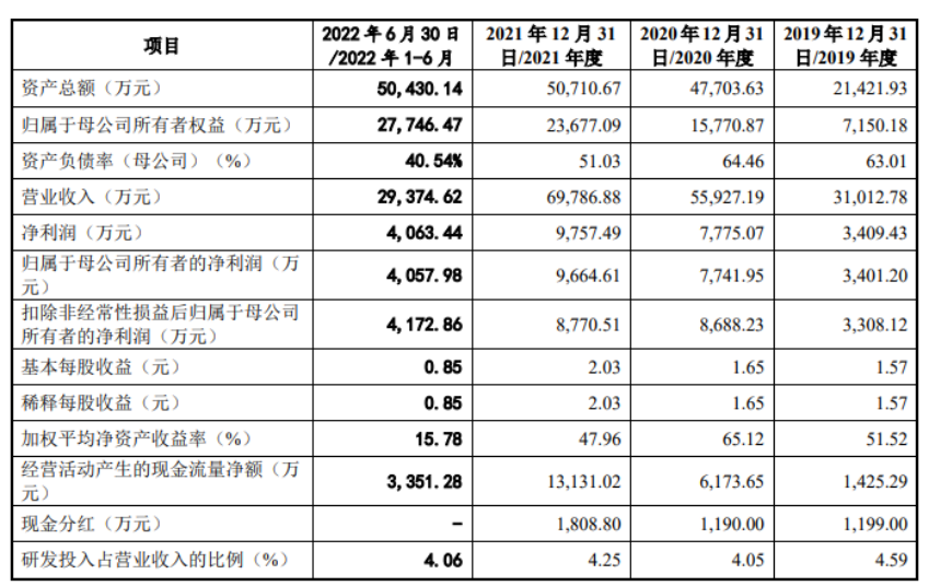 報(bào)告期內(nèi)(2019年、2020年、2021年、2022年1-6月份),瑋碩恒基營(yíng)業(yè)收入分別為3.10億元、5.59億元、6.98億元、2.94億元,歸母凈利潤(rùn)分別為3,401.20萬元、7,741.95萬元、9,664.61萬元、4,057.98萬元。