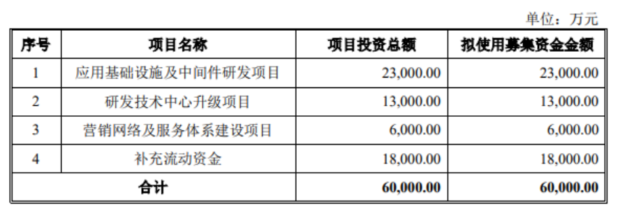 募資用途:此次IPO擬募資6億元,用于應(yīng)用基礎(chǔ)設(shè)施及中間件研發(fā)項(xiàng)目、研發(fā)技術(shù)中心升級(jí)項(xiàng)目、營(yíng)銷(xiāo)網(wǎng)絡(luò)及服務(wù)體系建設(shè)項(xiàng)目、補(bǔ)充流動(dòng)資金。
