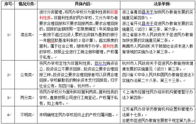 根據(jù)上表可知,目前對(duì)于民辦學(xué)校的性質(zhì)及資產(chǎn)歸屬問題,各地均有不同規(guī)定,但大體可以分為三類:一是公有,即舉辦者投資后資產(chǎn)屬于社會(huì)公有,舉辦者無權(quán)收回或取得回報(bào),如捐資設(shè)立的學(xué)校;二是準(zhǔn)公有,即舉辦者投資后資金不得撤回,但可以取得合理回報(bào),如學(xué)校終止清算時(shí),在有結(jié)余的情況下,舉辦者可以獲得投資本金和適當(dāng)回報(bào),剩余的資產(chǎn)則仍屬社會(huì)公有,由政府繼續(xù)投入到其他辦學(xué)事業(yè)。前兩類一般都登記為事業(yè)單位法人或者非企業(yè)法人,登記機(jī)關(guān)為民政部門;三是私有,即登記為公司形態(tài)的民辦學(xué)校,登記機(jī)關(guān)為工商管理/市場(chǎng)監(jiān)督部門。根據(jù)目前法規(guī),三類性質(zhì)的民辦學(xué)校之間是不能夠任意變動(dòng)和轉(zhuǎn)換的。新法允許舉辦營(yíng)利性或非營(yíng)利性民辦學(xué)校,但具體如何操作,特別是原來屬于非營(yíng)利性質(zhì)的民辦學(xué)校,如何清算并登記為營(yíng)利性質(zhì),其資產(chǎn)如何分配,尚需等各地出臺(tái)具體規(guī)定。
